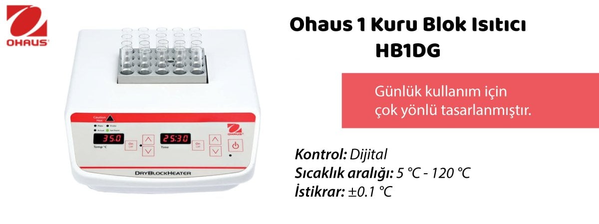 Ohaus 1 Kuru Blok Isıtıcı HB1DG; kültürlerin inkübasyonu ve aktivasyonu, enzim reaksiyonları, immünoanalizler, erime/kaynama noktaları, izotermal inkübasyonlar, nükleik asit denatürasyonu için idealdir.