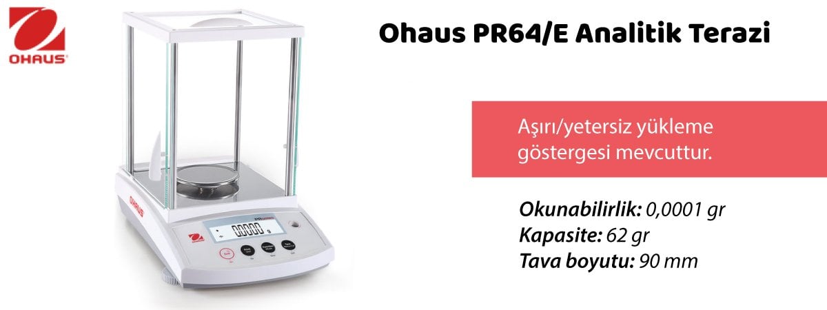 - Ohaus PR64/E Analitik Terazi; tartım, yüzde tartım, parça sayım uygulamaları için ideal kullanım sunar.