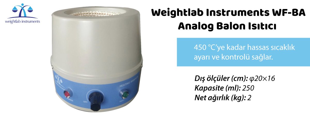 Weightlab Instruments'in öne çıkan kalitesiyle analog olarak üretilen laboratuvar cihazları arasında yer alan WF-BA Balon Isıtıcı cihazında üniform sıcaklık, her zaman hızlı ve güvenli ısıtma imkanı sunar. Weightlab Instruments, tasarım bakımından hafife alınmayacak noktalarından biri de soğuk haddeleme çeliğin gerilmesi ve püskürtülmesi ile meydana gelen cihaz tasarımıdır. Son derece uzun ömürlü bir kullanım vaat eden yüksek mukavemetli yapısı korozyona karşı büyük bir dayanıklılık sağlar.